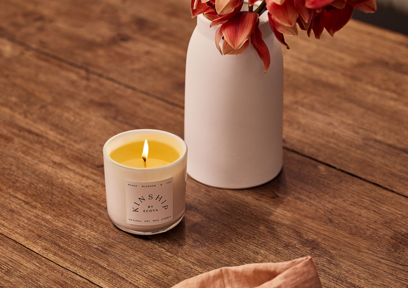 The KINSHIP by ECOYA Candle blends natural soy wax with contemporary fragrances designed by ECOYA. Peach Blossom & Iris Scent Burn time up to 65 hours...